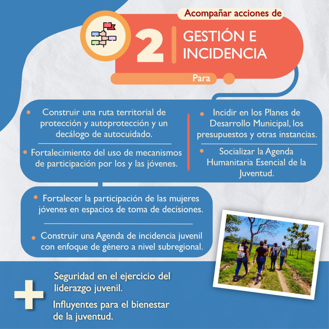 Durante dos años, la iniciativa Juventud Gestora de Cambio impulsó y acompañó un proceso de fortalecimiento de las instancias de participación juvenil y a la institucionalidad de seis municipios en el sur del Meta, brindando herramientas para el fortalecimiento de capacidades de gestión, concertación, comunicación e incidencia.