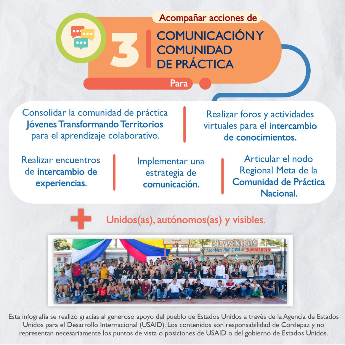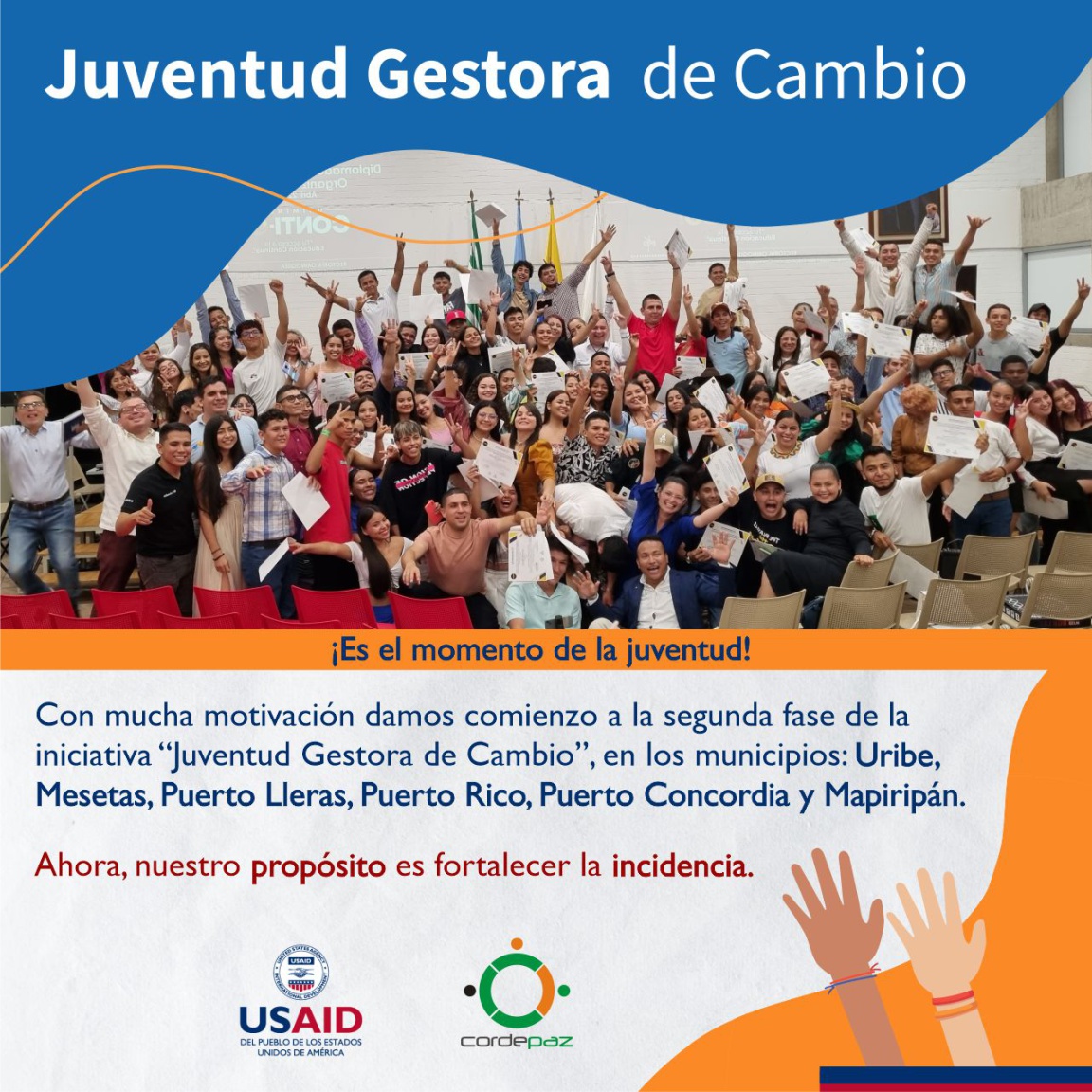 Somos un movimiento juvenil integrado por líderes y lideresas de los Consejos Municipales de Juventud, Plataformas de Juventudes y Enlaces de Juventud de Mapiripán, Puerto Rico, Puerto Lleras, Puerto Concordia, Mesetas y Uribe en el Sur del Meta, vinculadas al desarrollo de la iniciativa Juventud Gestora de Cambio, implementada por Cordepaz en alianza con el Programa Gobernabilidad Responsable de USAID Colombia.